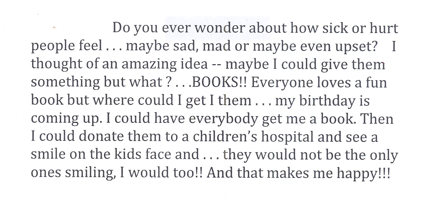 One of our very own Coman Hill students had a great idea and donated books to a children's hospital! Read the paragraph below to see how she got her idea.